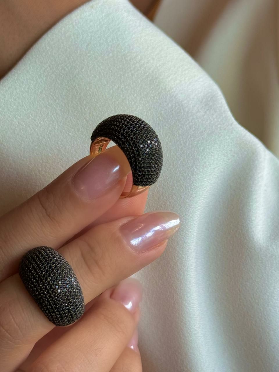 Transforme qualquer look com a sofisticação deste anel banhado a ouro 18k, cuidadosamente cravejado com uma deslumbrante zircônia preta de alto brilho. Seu design refinado combina beleza e presença, criando uma peça que se destaca pela luminosidade e pelo acabamento impecável.